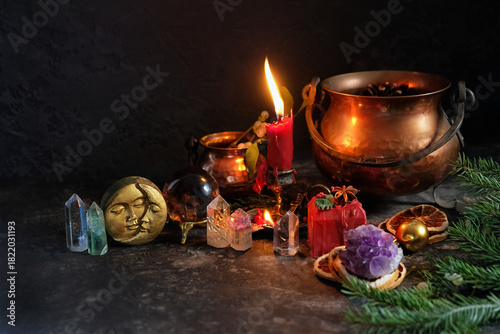 © Ju_see, Naklejka premium Wiccan altar for Yule holiday. Burning candle, moon amulet, mineral gemstones, witch cauldrons, decor, fir branches on dark table. Crystal Ritual. witchcraft, magic ceremony for Yule, Winter Solstice
