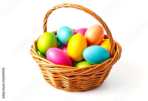 Naklejka premium wicker basket with colorful Easter eggs, on a white background, isolated