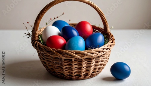 © Moon, Naklejka premium Wicker basket with colorful eggs and festive twigs.