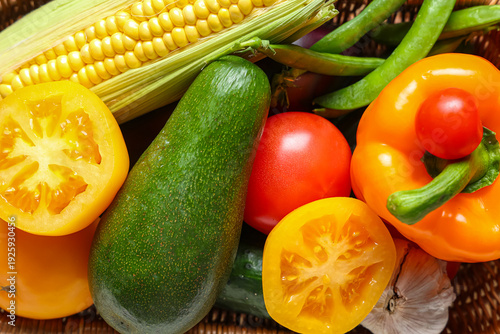 © Pixel-Shot, Fototapeta premium Wicker basket with different fresh vegetables, closeup