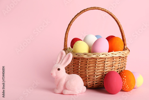 Naklejka premium Wicker basket with painted Easter eggs and bunny on pink background