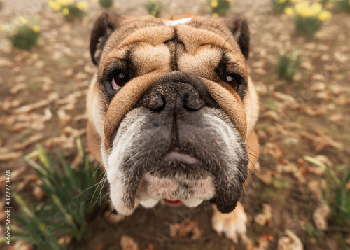 Obraz premium wide angle close up of Red English Bulldog out for a walk sitting on ground