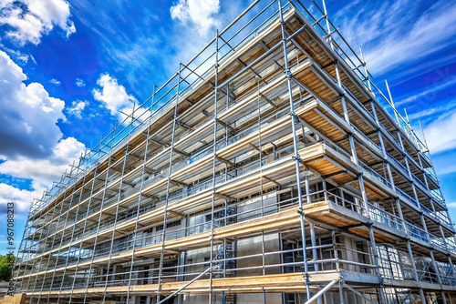 © methinee, Fototapeta premium Wide-Angle Multi-level Scaffolding on Building Facade