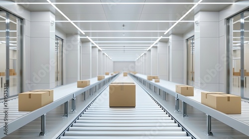 © AdriFerrer, Fototapeta premium Wide angle of a conveyor system in a clean and modern warehouse.