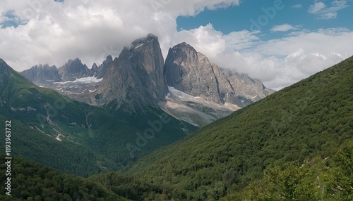 © soyibakter, Obraz premium Wide angle panoramic view of the mountain peaks covered with snow SS4