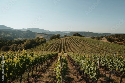 Fototapeta premium Wide-angle perspective of grape fields on rolling terrain