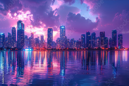 Obraz premium Wide angle shot of an expansive city skyline at sunset with lively colors reflecting off the buildings.. AI generated.