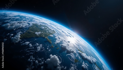 Fototapeta premium Wide-Angle Shot of Earth in Space with Swirling Clouds and Glowing Atmosphere...