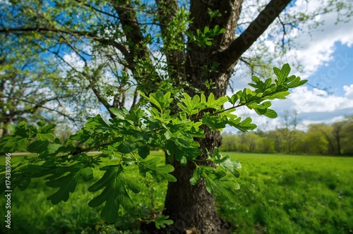 © The 2R Artificiality, Obraz premium Wide-angle shot of fresh oak leaves in early spring on a tree