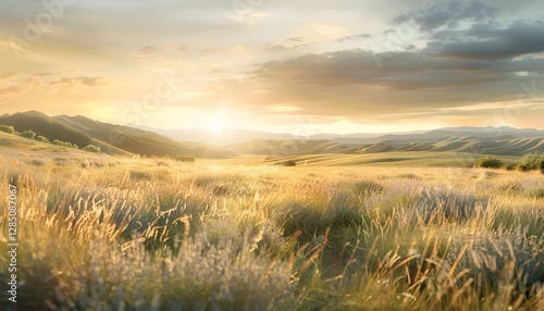 Fototapeta premium Wide-angle shot of glowing fields of lavender framed by rolling hills at sunset, cinematic serene depth