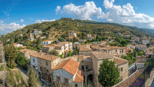 © vxnaghiyev, Obraz premium Wide-angle view of a charming mountain settlement with traditional architecture.