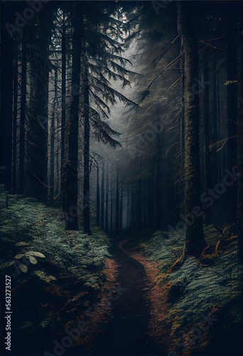 © Whitefeather, Naklejka premium wide angle view of a dark gloomy foggy forest Generative AI