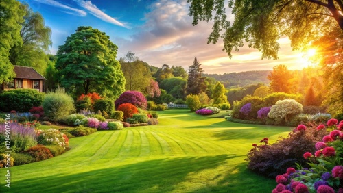 Naklejka premium Wide-angle view of a lush, expansive lawn bathed in summer sunlight; nature's...