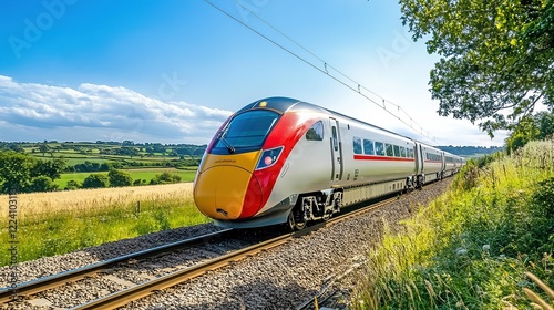 © tiantian, Fototapeta premium Wide-Angle View of a Sunny Day: Ultra-Fast Modern Train Speeds Through Picturesque Countryside, Symbolizing Progress and Efficiency with Its Sleek Design and Powerful Engine.