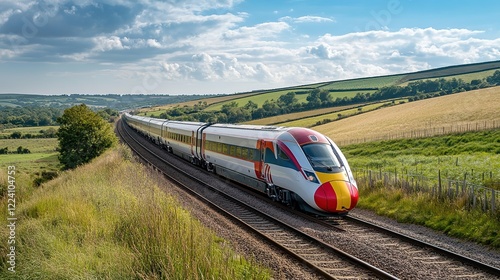© tiantian, Fototapeta premium Wide-Angle View of a Sunny Day: Ultra-Fast Modern Train Speeds Through Picturesque Countryside, Symbolizing Progress and Efficiency with Its Sleek Design and Powerful Engine.