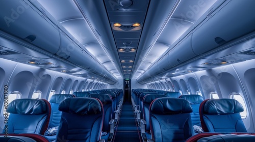 © Paul, Fototapeta premium Wide-angle view of an empty plane cabin, showcasing rows of clean seats, large windows, and overhead bins, ready for passengers