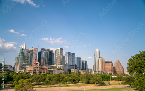 Fototapeta premium Wide Angle View of Austin Texas Skyline With Mostly Clear Skies in a summer...