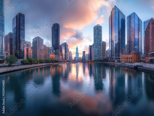 © AssanAI.Studio, Fototapeta premium Wide Angle View of Chicago Skyline at Sunset