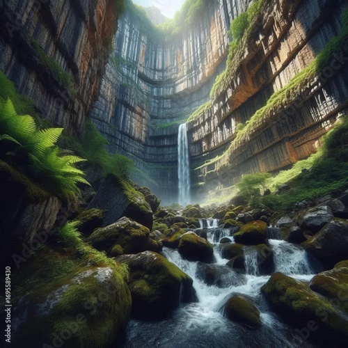 © andrew, Fototapeta premium Wide Angle View of Craggy Cliffs and Sheer Rock Waterfall with F