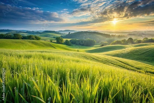 Fototapeta premium Wide-angle view of dewy grass in rolling hills of Kentucky