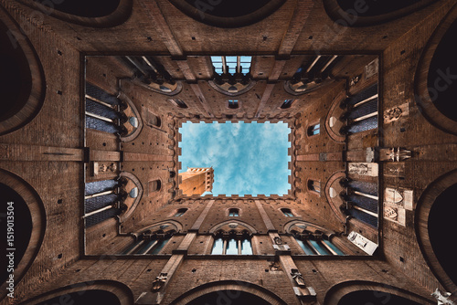 Obraz premium Wide angle view of famous Torre del Mangia at Palazzo Pubblico in Siena,...