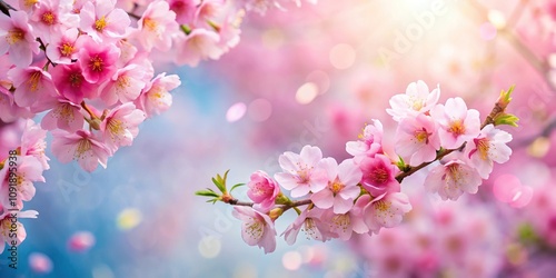 © Latsamee, Obraz premium Wide-angle view of pink cherry blossoms against a pastel background