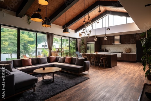 © Afi Kreative, Naklejka premium Wide angle view of spacious and modern contemporary living room in villa interior decor using generative AI