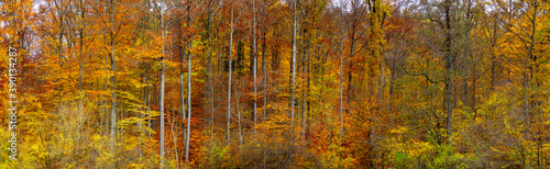 Fototapeta premium Wide autumn forest panorama with pleasant warm colors