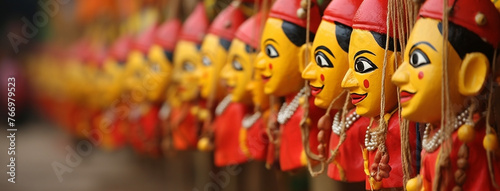 © Sudarshana, Naklejka premium wide background banner of Colorful human face mask dummies hanging on streets in Hindu cultural event Dussehra festival