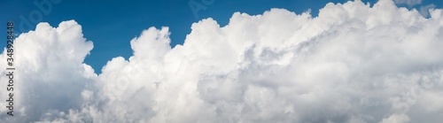 Fototapeta premium Wide background with copy space with white puffy clouds on a blue sky