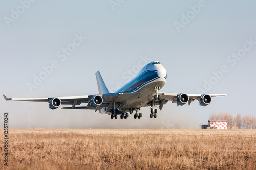 © Dushlik, Obraz premium Wide body cargo airplane takes off leaving behind a cloud of dust