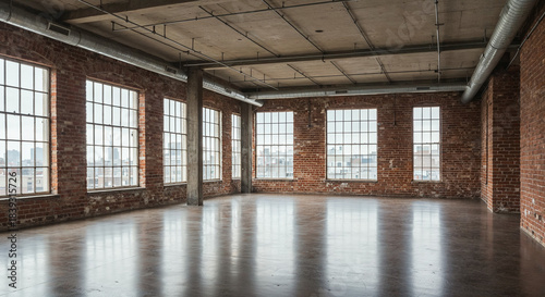 Fototapeta premium Wide, bright loft interior with glossy concrete and open space.