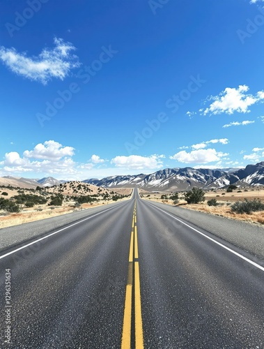 © Hugnaka, Naklejka premium Wide empty highway asphalt road stretching into the distance under a clear blue sky with gentle mountain landscape in the background, vast, landscape