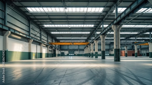 © irawan710, Obraz premium Wide, empty industrial warehouse with tall ceilings and concrete floor, well-lit by skylights