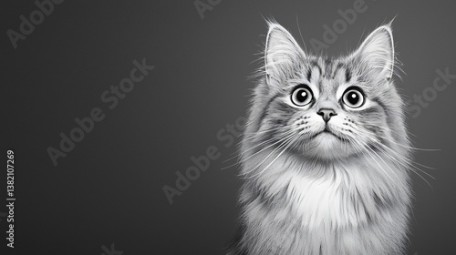 © ArtSync Studio, Fototapeta premium Wide Eyed Long Haired Tabby Cat Staring Upward in Monochrome Style on a Plain Gray Background