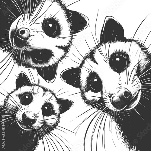 © Oleksandr Pokusai, Naklejka premium wide-eyed opossums peering downward in a circle, with expressive faces and whiskers sketch engraving generative ai vector illustration. Scratch board imitation. Black and white image.