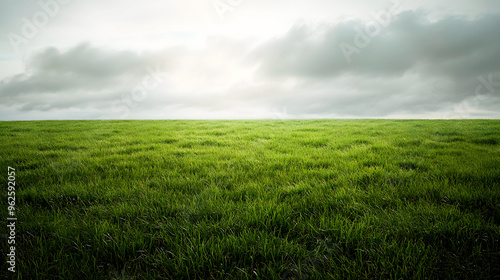 © Nattawaw bbt, Fototapeta premium wide green field with thick, vibrant grass, set against the backdrop of a cloudy, grey sky