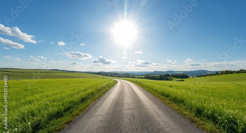 © TheWaterMeloonProjec, Fototapeta premium Wide meadow expanse highlighted by a central small road pathway