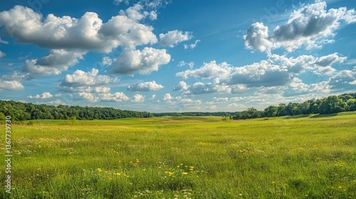 © Franklin, Obraz premium Wide Meadow with Wildflowers Beneath Blue Sky and Trees