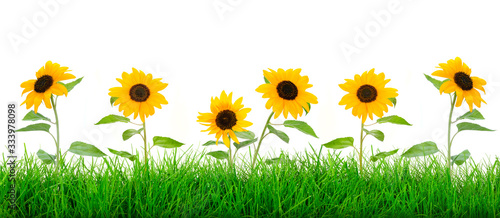 Fototapeta premium Wide natural green grass meadow with blooming sunflowers on a white background.