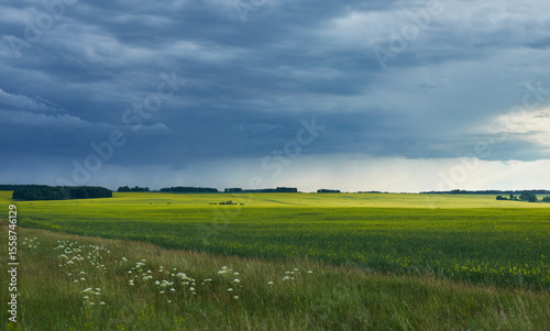 © Maksim, Fototapeta premium Wide open countryside field under dark cloudy summer sky