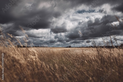© nabakumar, Fototapeta premium wide open field of tall grass with dramatic cloudy sky