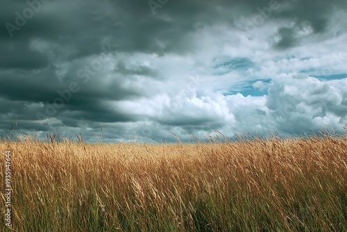 Fototapeta premium wide open field of tall grass with dramatic cloudy sky