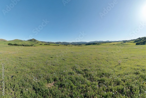 © rashyn, Fototapeta premium Wide open field with wildflowers under a clear sky, distant hills