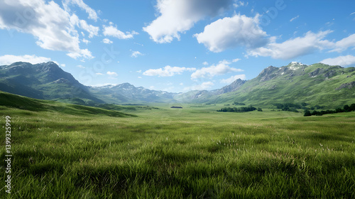 Naklejka premium Wide Open Meadow And Mountains Under Sunny Sky