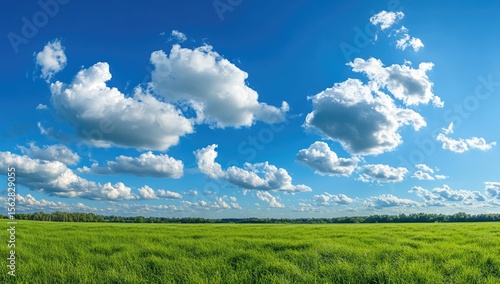 © Bintang, Fototapeta premium Wide panorama of a vibrant green field under a vast, blue sky dotted with fluffy white clouds