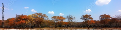 © Ross, Fototapeta premium Wide Panoramic Landscape of a Forest in Fall Colors under a Spacious Blue Sky