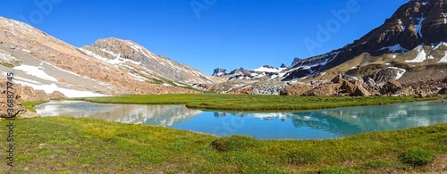 Fototapeta premium Wide Panoramic Landscape of Brazeau River Calm Blue Water with Scoured Rock...