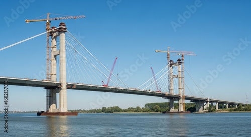 © AMH FX STOCK, Obraz premium Wide panoramic shot of a suspension bridge under construction over a calm river, cranes lifting steel sections, clear blue sky with empty space for copyspace, minimal text distractions, modern enginee