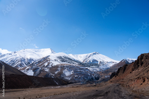 Fototapeta premium Wide panoramic view of a vast landscape featuring snow-capped mountains and a...